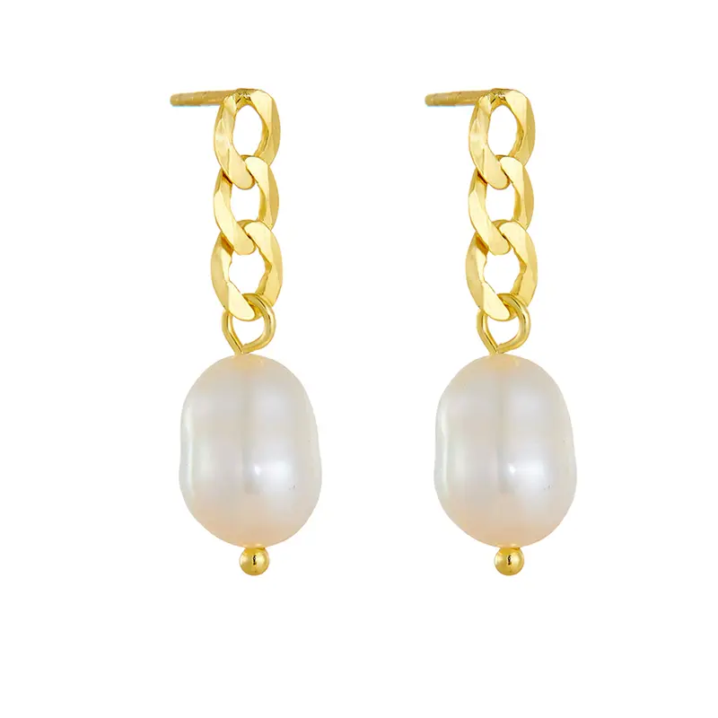 Peishang Wholesale Jewelry 925 Sterling Silver 14K Gold Plated Cuban Chain Drop Pearl Stud Earrings