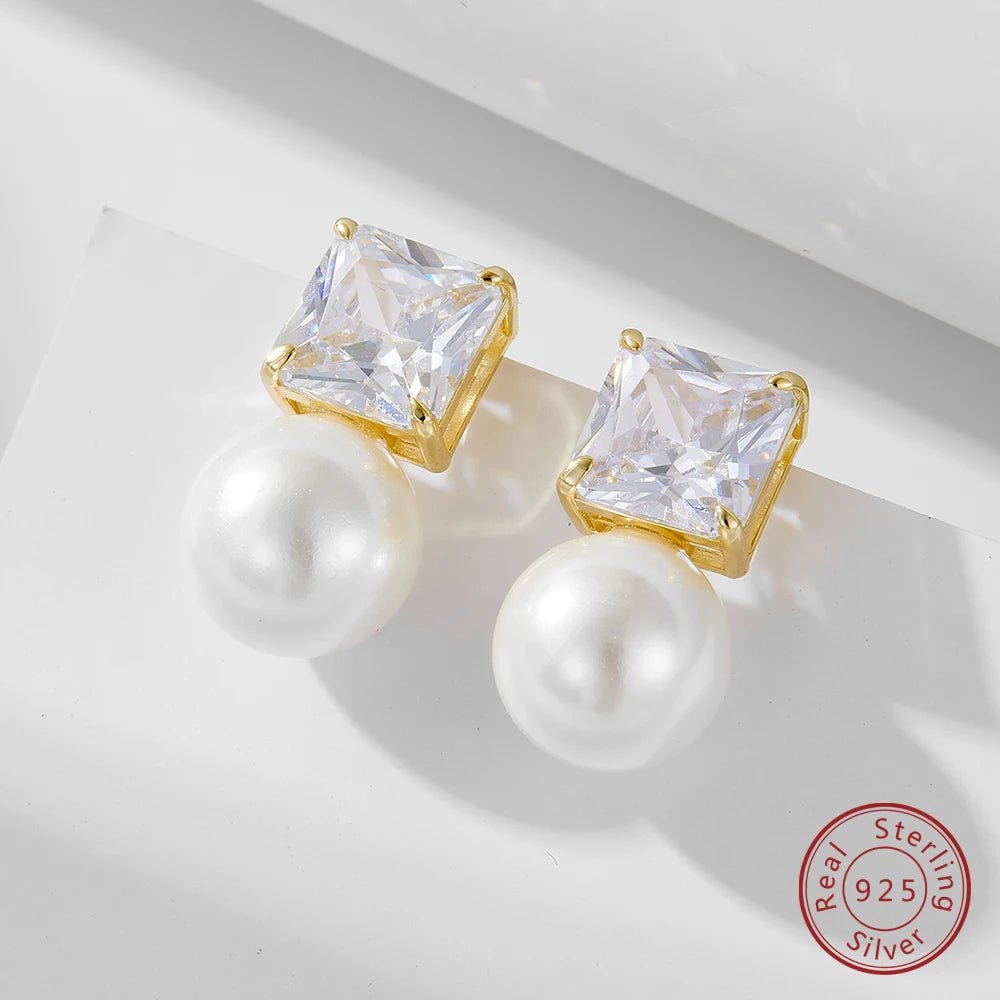 New Trendy S925 Sterling Silver Square Zircon Pearl Earrings Fine Jewelry for Women Valentine’s Day Gift