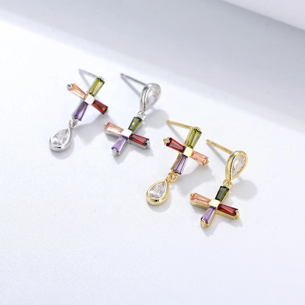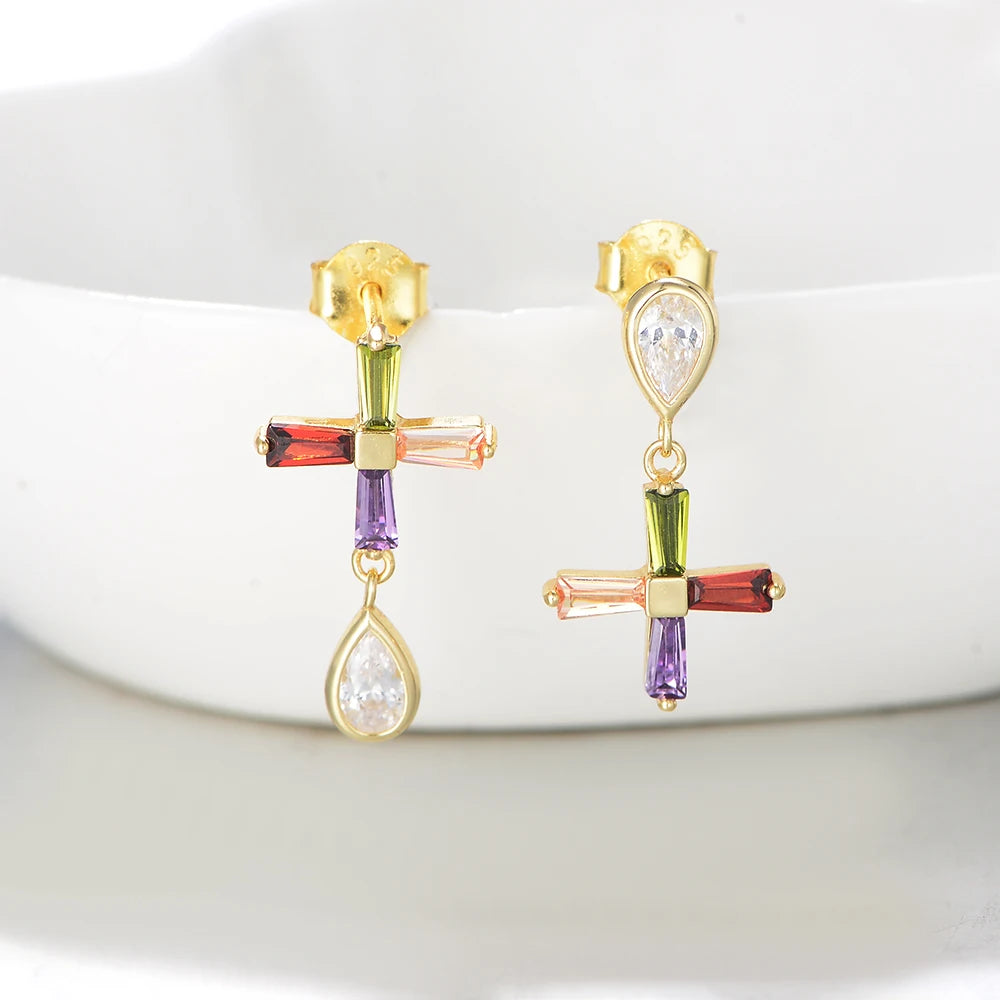 14k Gold Plated Dangle Earrings Trendy 925 Pear Cz Colorful Cross Silver Stud Earrings