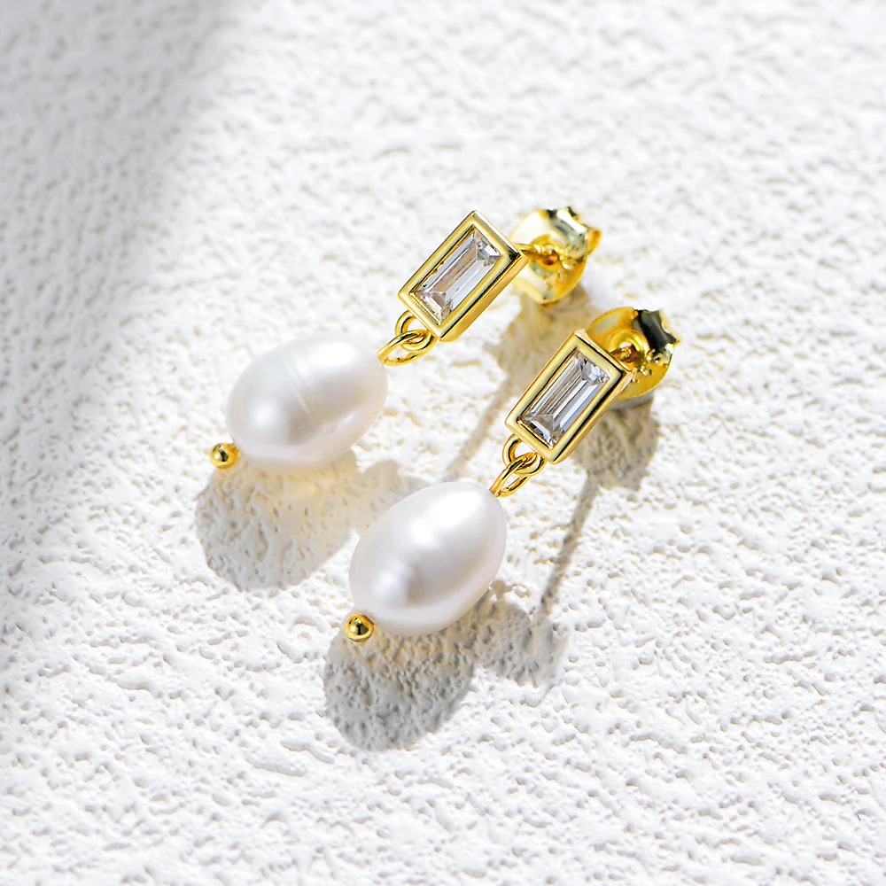 Peishang Jewelry 925 Sterling Silver 14K Gold Plated Pearls Geometric Square Stud Earrings for Women