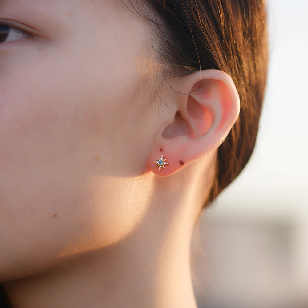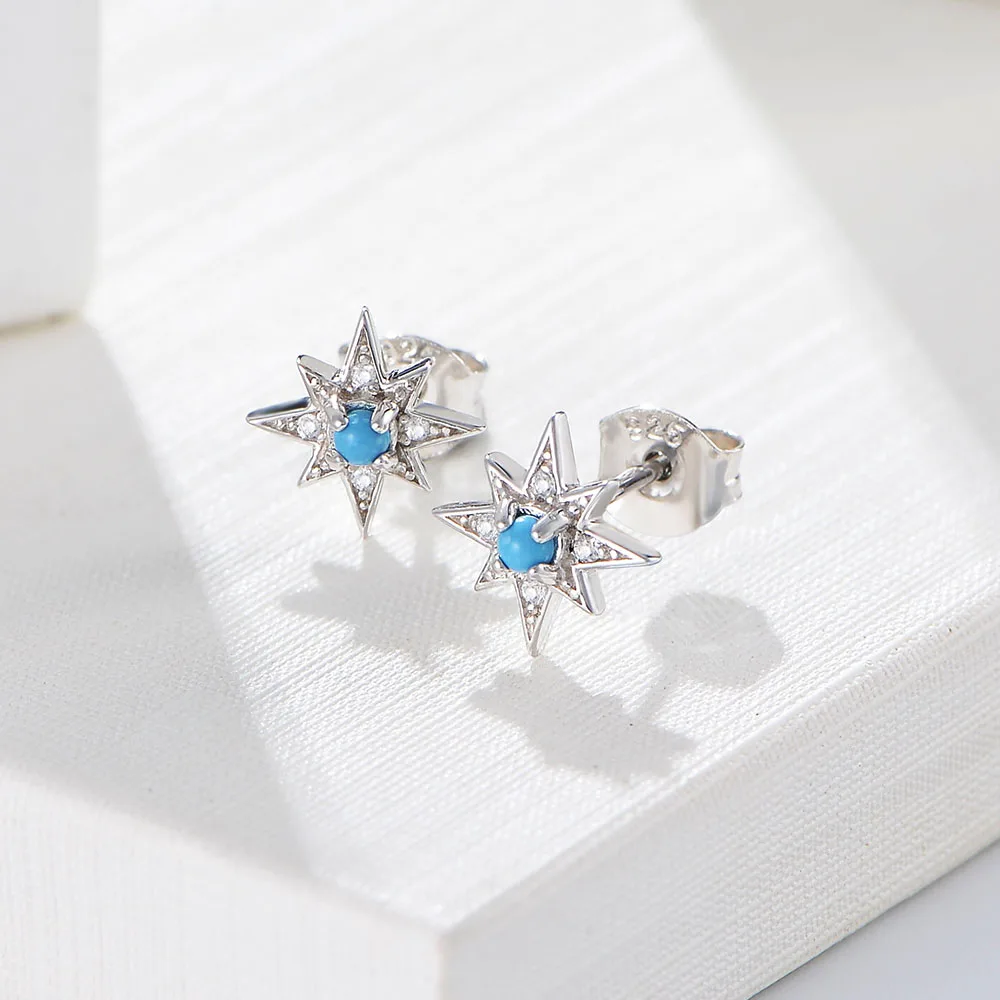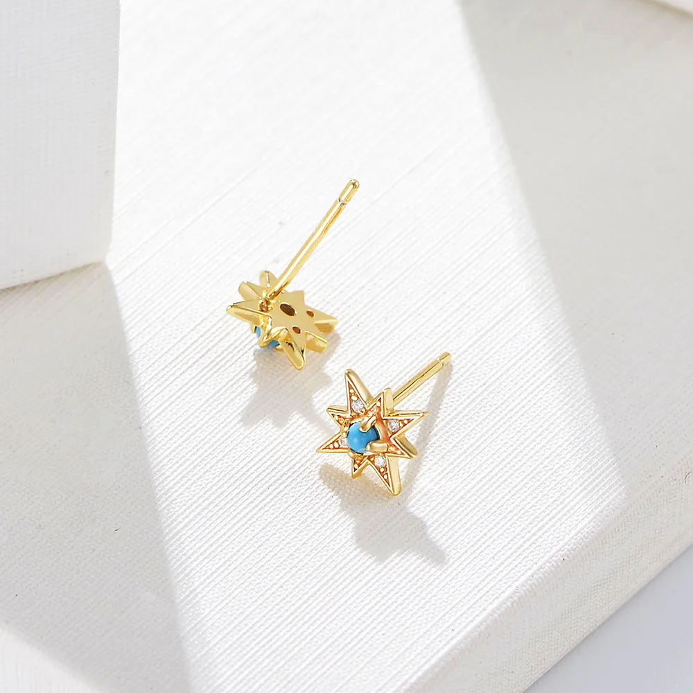 Women Girls Turquoise Gemstone Starburst Jewelry Psj S 925 Sterling Silver 14k Gold Plated Bling CZ Zircon Huggies Stud Earrings